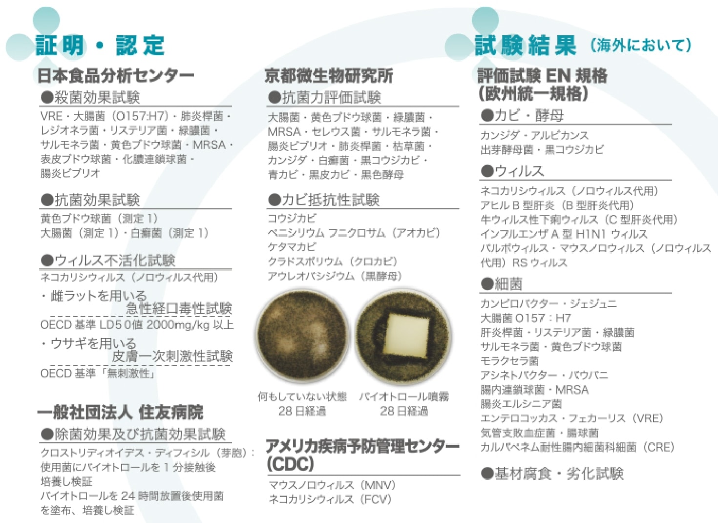 * 全ての微生物(バクテリア、ウイルス、菌類、カビ類、藻類)に有効です。